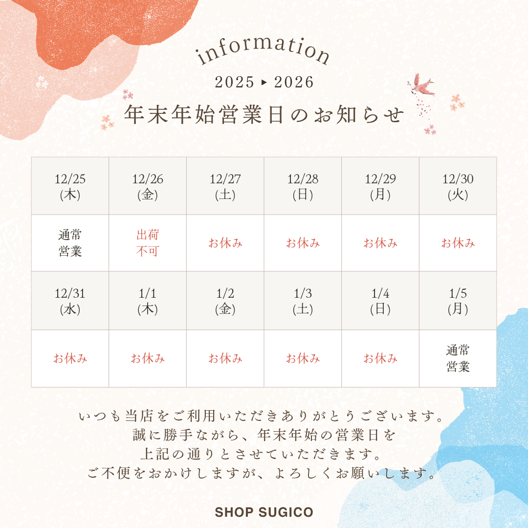 誠に勝手ながら、2025年12月26日(金)~2026年1月4(日)まで、年末年始休業とさせていただきます。